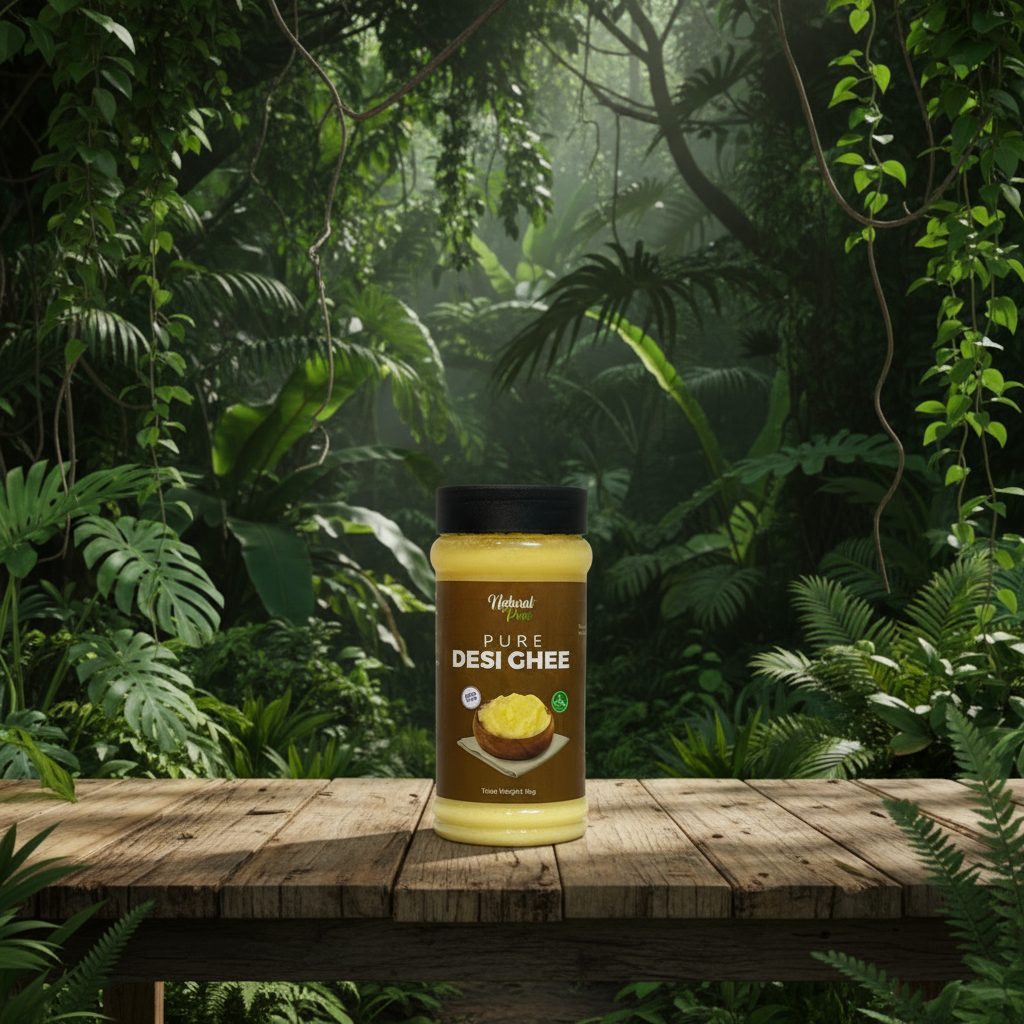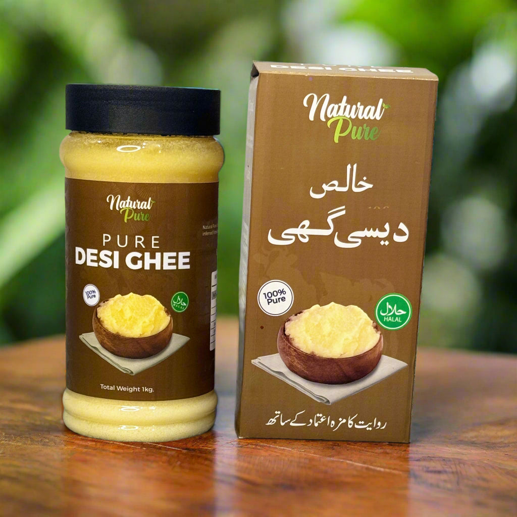 Natural Pure Desi Cow Ghee made from fresh cow milk butter (مکھن), cooked slowly for authentic aroma, grainy texture, and rich taste. No vegetable oil, no artificial color, no essence — just real, traditional desi ghee delivered fresh to your doorstep in Pakistan.